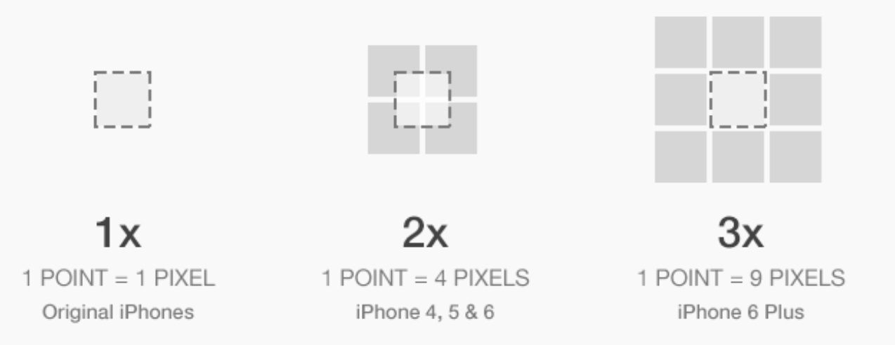 위의 이미지처럼 다양한 해상도를 가진 아이폰들이 출시되면서 하나의 포인트에 대하여 하나의 픽셀이 대응하는 형태에서 하나의 포인트에 여러개의 픽셀이 존재하는 형태로 변경이 되었습니다. 아래의 도표와 이미지를 통하여 포인트 당 대응하는 픽셀을 확인할 수 있습니다.