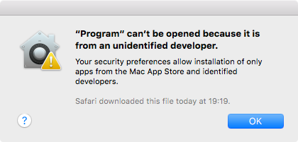 윈도우즈와 마찬가지로 맥 생태계에서도 인터넷으로 다운 받는 앱에 대해서는 보안검증이 이루어진다.앱을 누가 만들었는지를 알 수 없거나 악성 코드 체크가 이루어지지 않는 경우 아래 그림