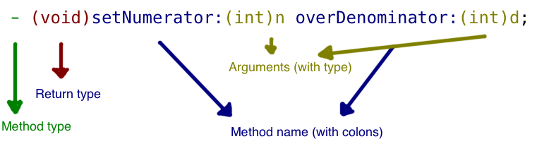 The majority of the following text is derived from Apple’s authoritative guide on the Objective-C language—The Objective-C Programming Language*: Chapter 1: Objects, Classes, and Messaging.* Message Syntax You send a message to an object to have it do