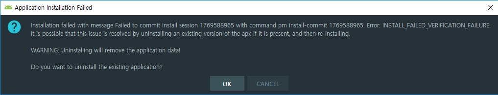 Installation failed with message Failed to commit install session 1430158669 with command pm install-commit 1430158669. Error: INSTALL_FAILED_VERIFICATION_FAILURE. It is possible that this issue is resolved by uninstalling an existing version of the apk if it is present, and then re-installing.