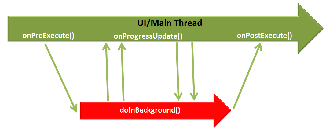 onProgressUpdate() : This method receives progress updates from doInBackground method, which is published via publishProgress method, and this method can use this progress update to update the UI thread