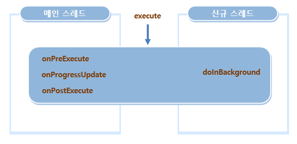 비동기 작업은 매개변수, 진행과정 그리고 결과라는 3가지의 일반 유형과 onPreExecute, doInBackground, onProgressUpdate, onPostExecute의 4가지 단계로 정의된다.