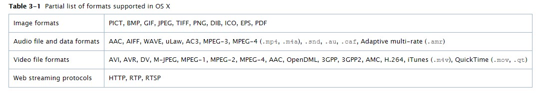 🍎 Media Layer - OS X supports more than 100 media types, covering a range of audio, video, image, and streaming formats. Table 3-1 lists some of the more common supported file formats.